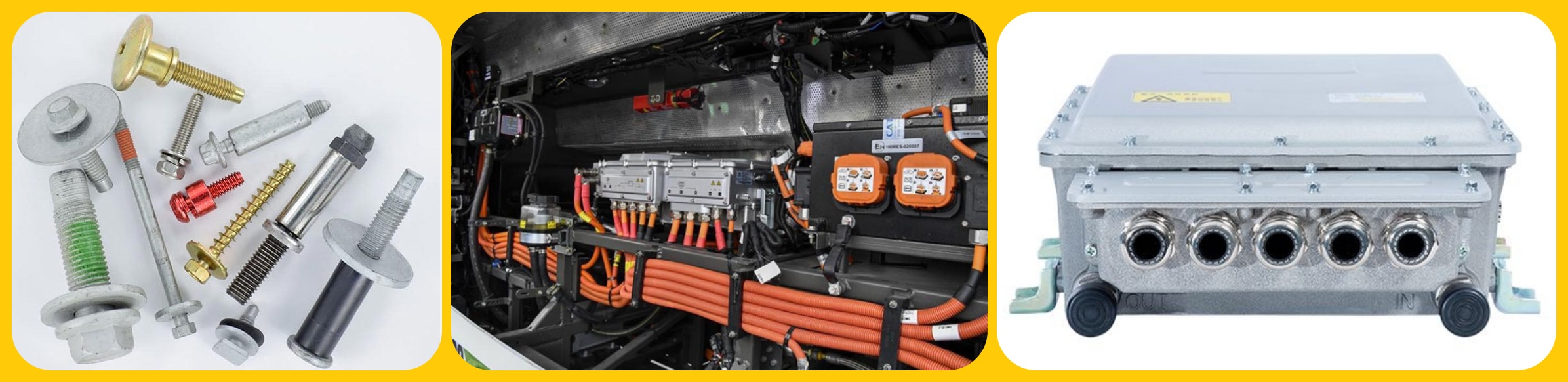 اتصال دهنده های نصب سیستم موتور/درایو E-Drive: سیستم موتور و درایو الکترونیکی منبع تغذیه وسیله نقلیه است و اتصال دهنده های نصب آنها باید در برابر گشتاور و ارتعاشات ایجاد شده در طول کار موتور مقاومت کنند و از توان پایدار اطمینان حاصل کنند. استحکام بالا و عملکرد ضد لوزشه ای قابل اعتماد الزامات مهمی برای این اتصال دهنده ها است.